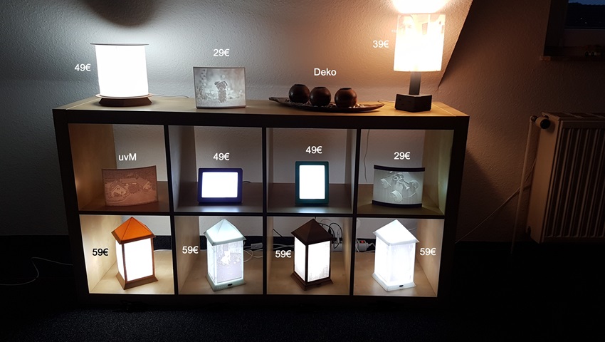 Der Würfel ist mein Erstlingswerk, sieht schick aus. Die Fotos übrigens zeigen die noch immer einzige Version. Auch die 5 Motive können jederzeit getauscht werden. Der Würfel würde bei Interesse natürlich technisch auf den neuesten Stand (E14) gebracht.